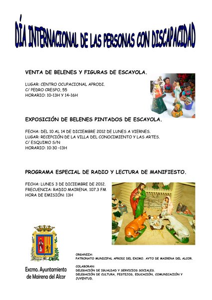 El centro ocupacional APRODI de Mairena del Alcor, celebran el Día Internacional de las Personas con Discapacidad con la exposición y venta de figuras de escayola en la Calle Pedro Crespo, nº 55. De lunes a viernes en horario de mañana de 10:00 a 13:00 horas y de tarde de 14:00 a 16:00 horas.